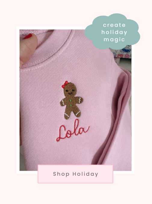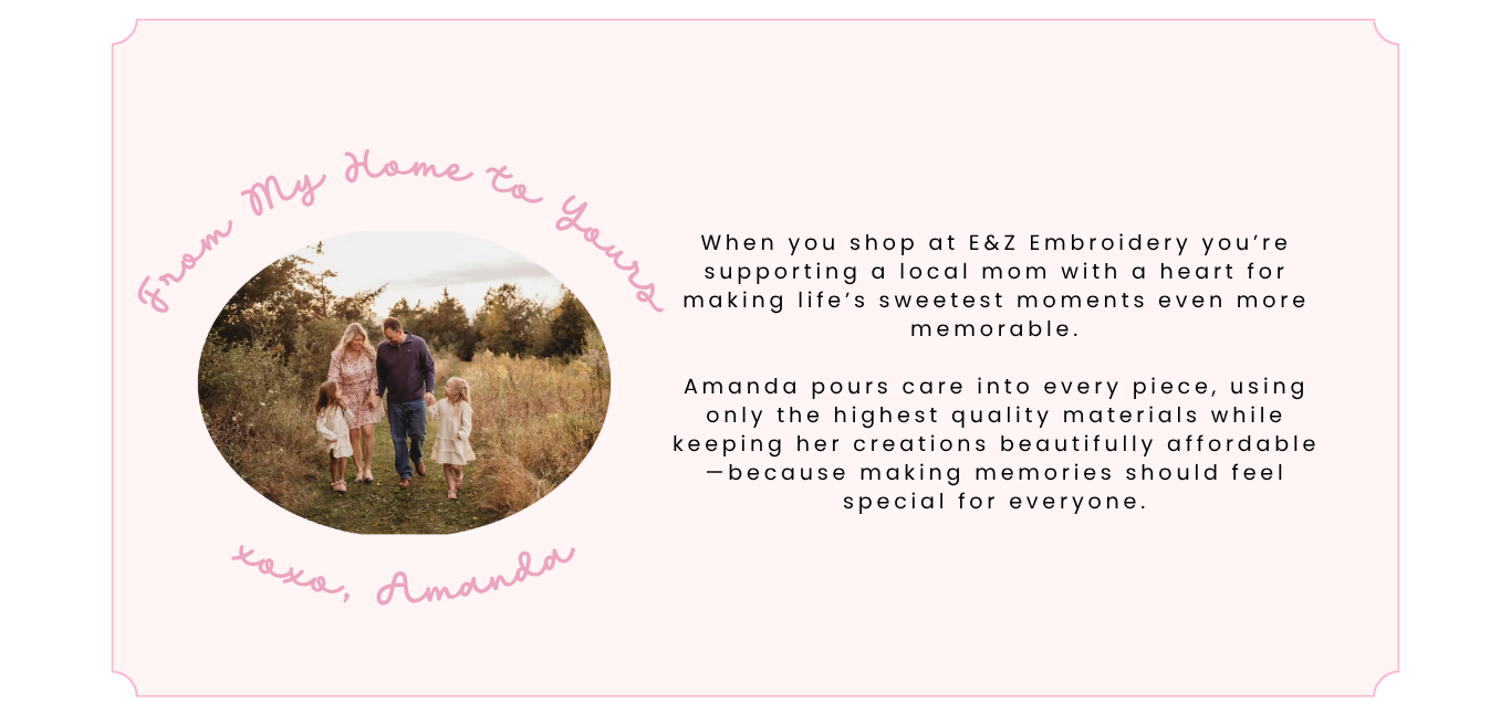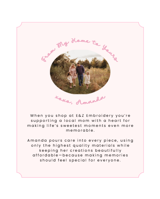 “I love having Amanda, of E&Z Embroidery, create one-of-a-kind pieces for my family, friends, and me! Not only does Amanda make quality pieces quickly, but she also takes the time to help you make your items unique and special. Whether it be a baby shower gift or a holiday celebration design, E&Z Embroidery is my go-to for embroidery needs.”