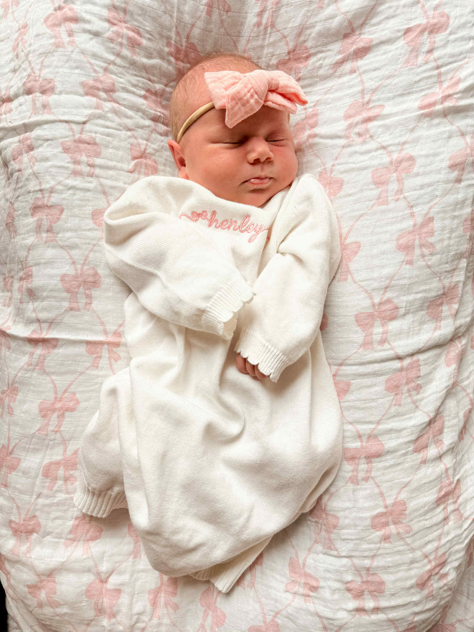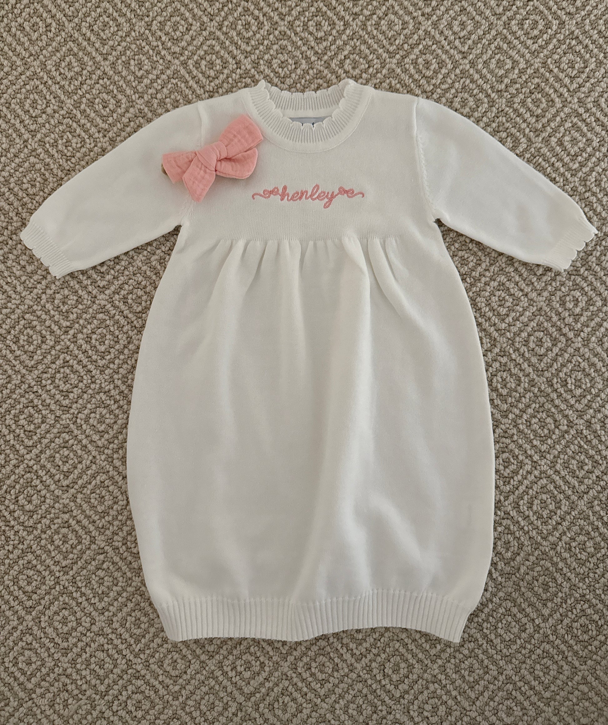 The most beautiful gown perfect for hospital pictures to announce baby girl's birth! The gown design makes diaper changing a breeze. The sweet scallops along the neckline provide the sweetest detail!