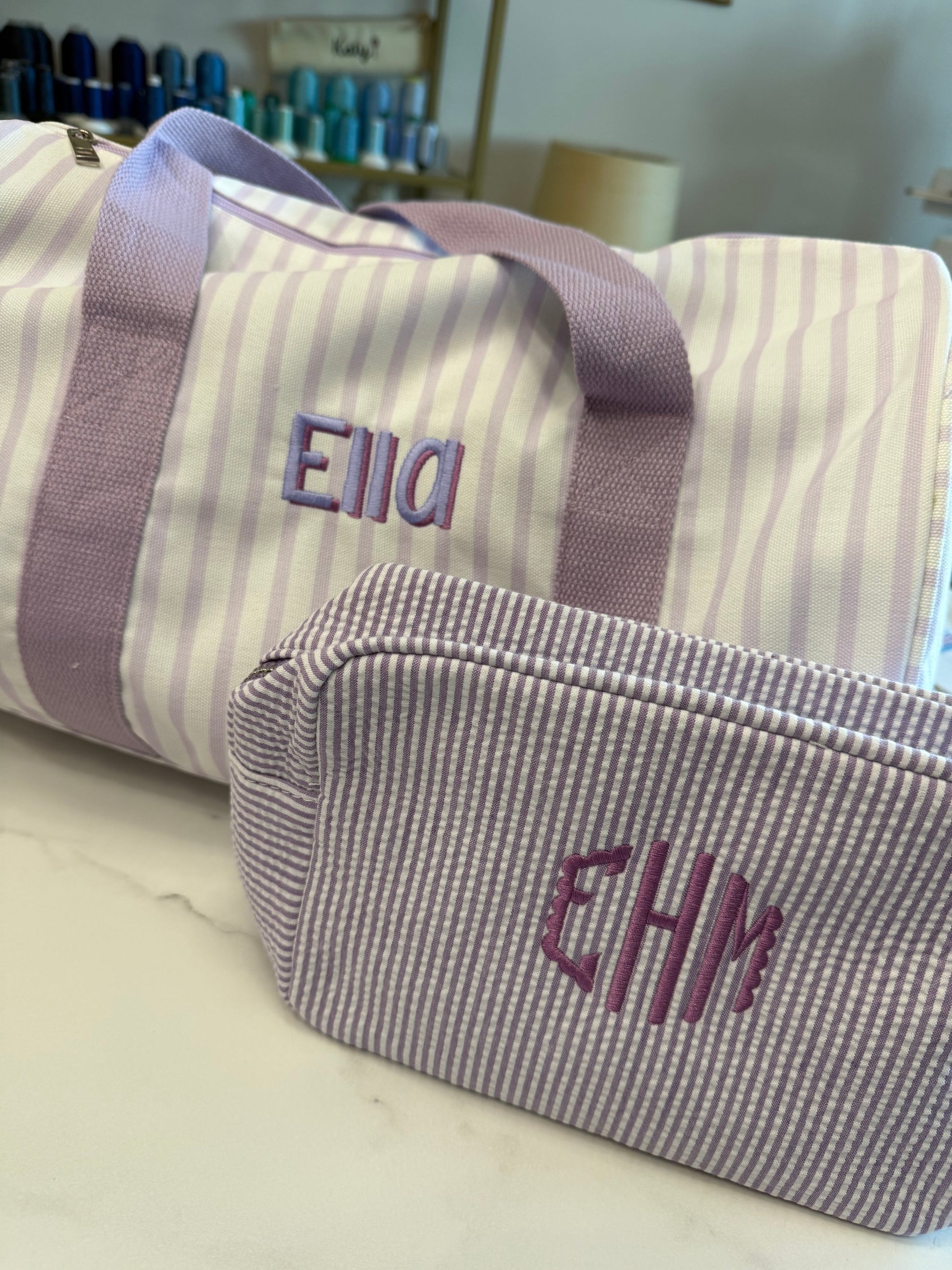 Examples of pieces we have included in the Sunshine Big Kid Gift Bundle in the past include personalized: beanies, duffel bags, cosmetic & toiletry bags, pencil pouches, stuffed animals, crewnecks, t shirts, belt bags and monogrammed bows.