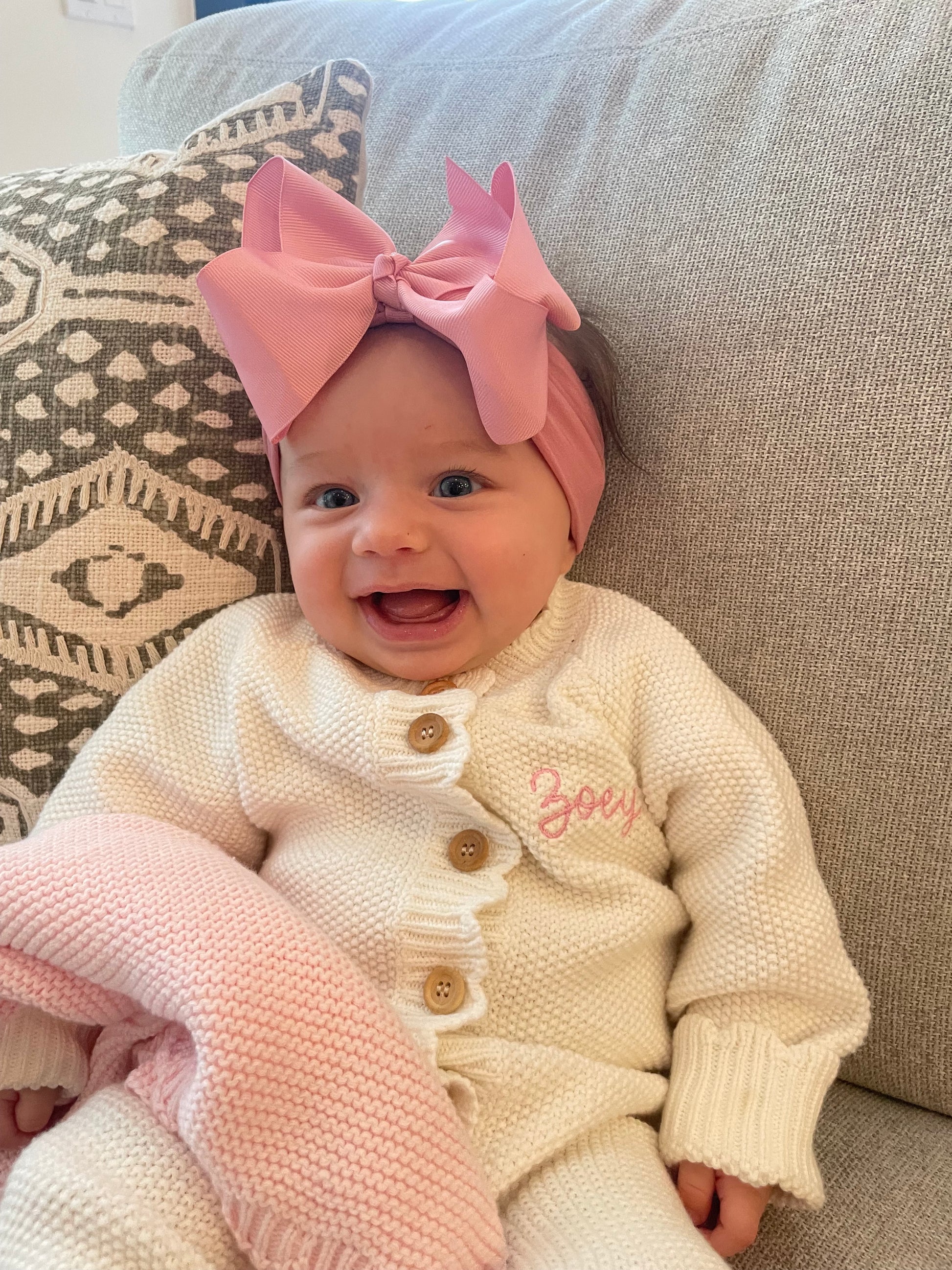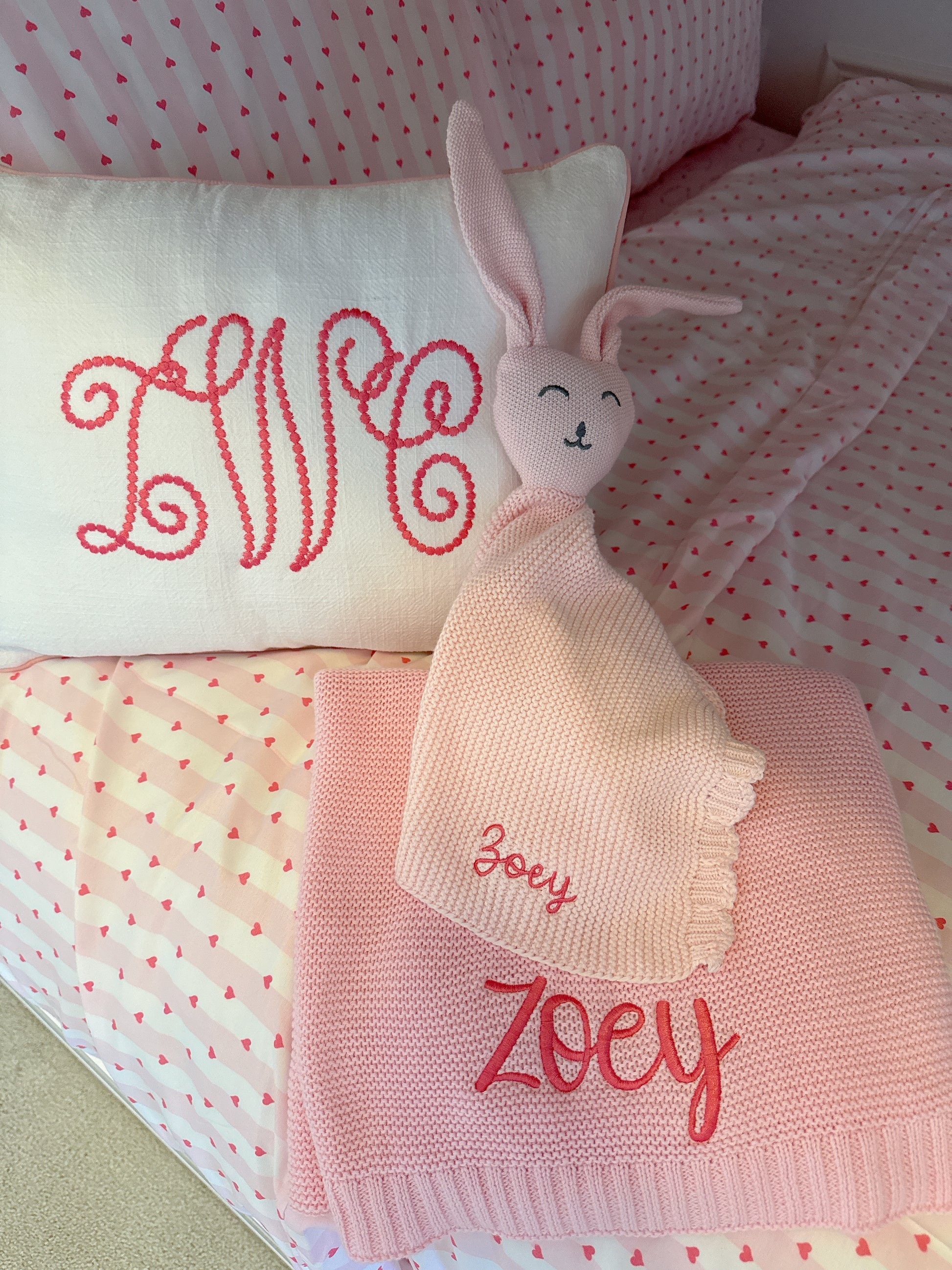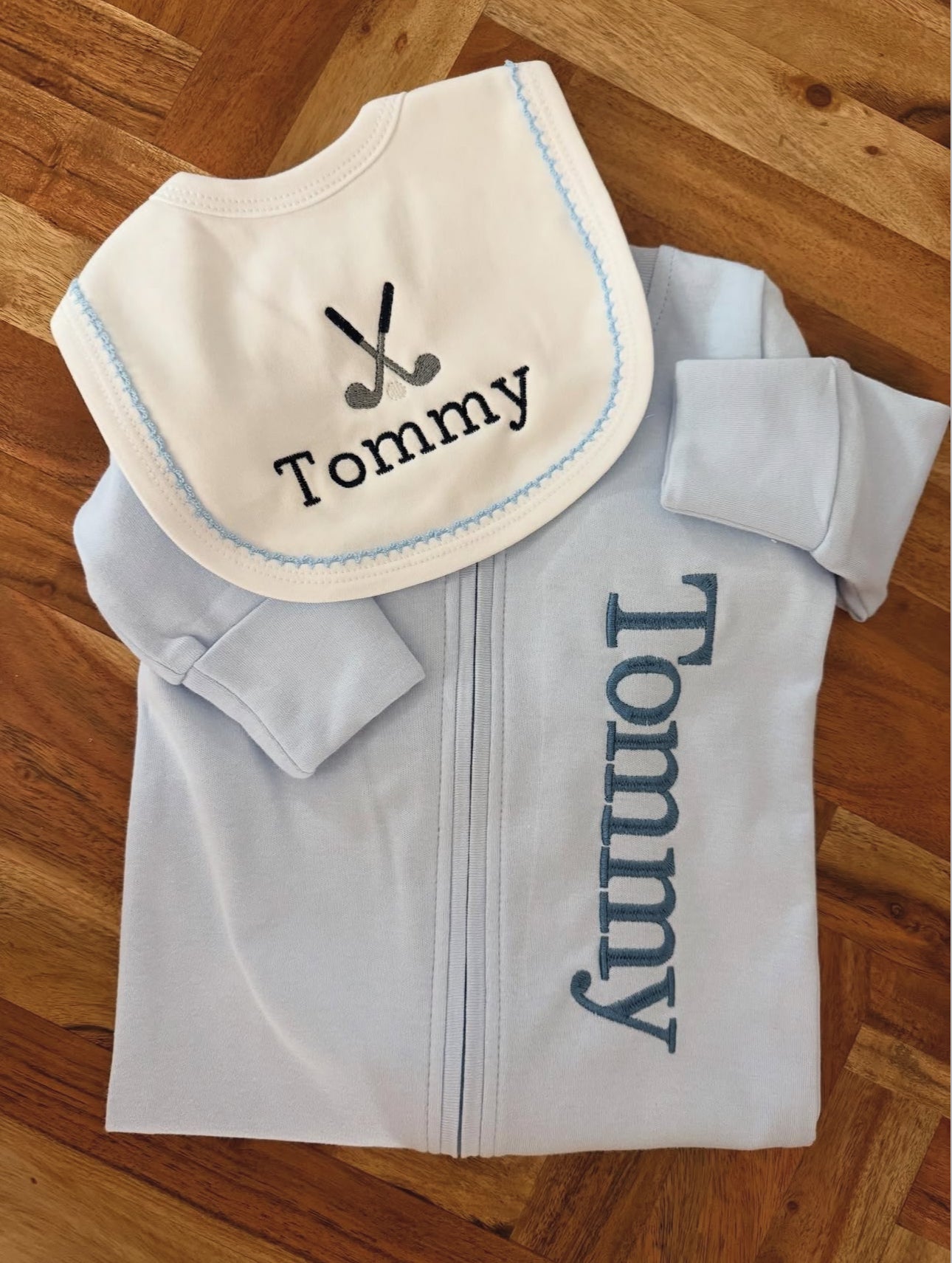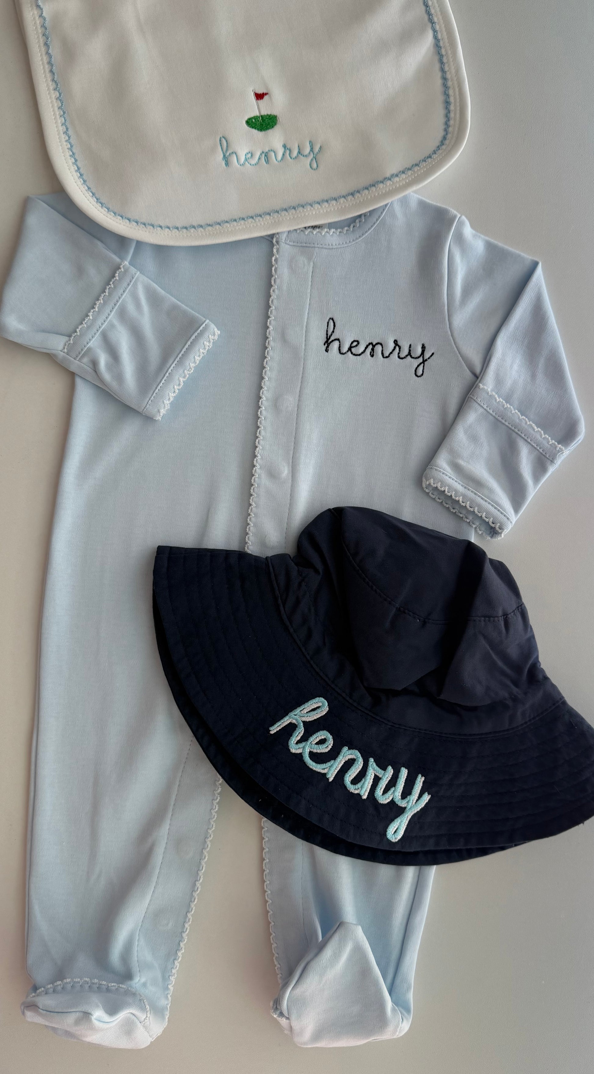 Examples of pieces we have included in the Welcome to the World Bundle in the past include personalized: sleepers, bibs, blankets, loveys, beanies, sunhats, bows, hooded bath towels and onesies.